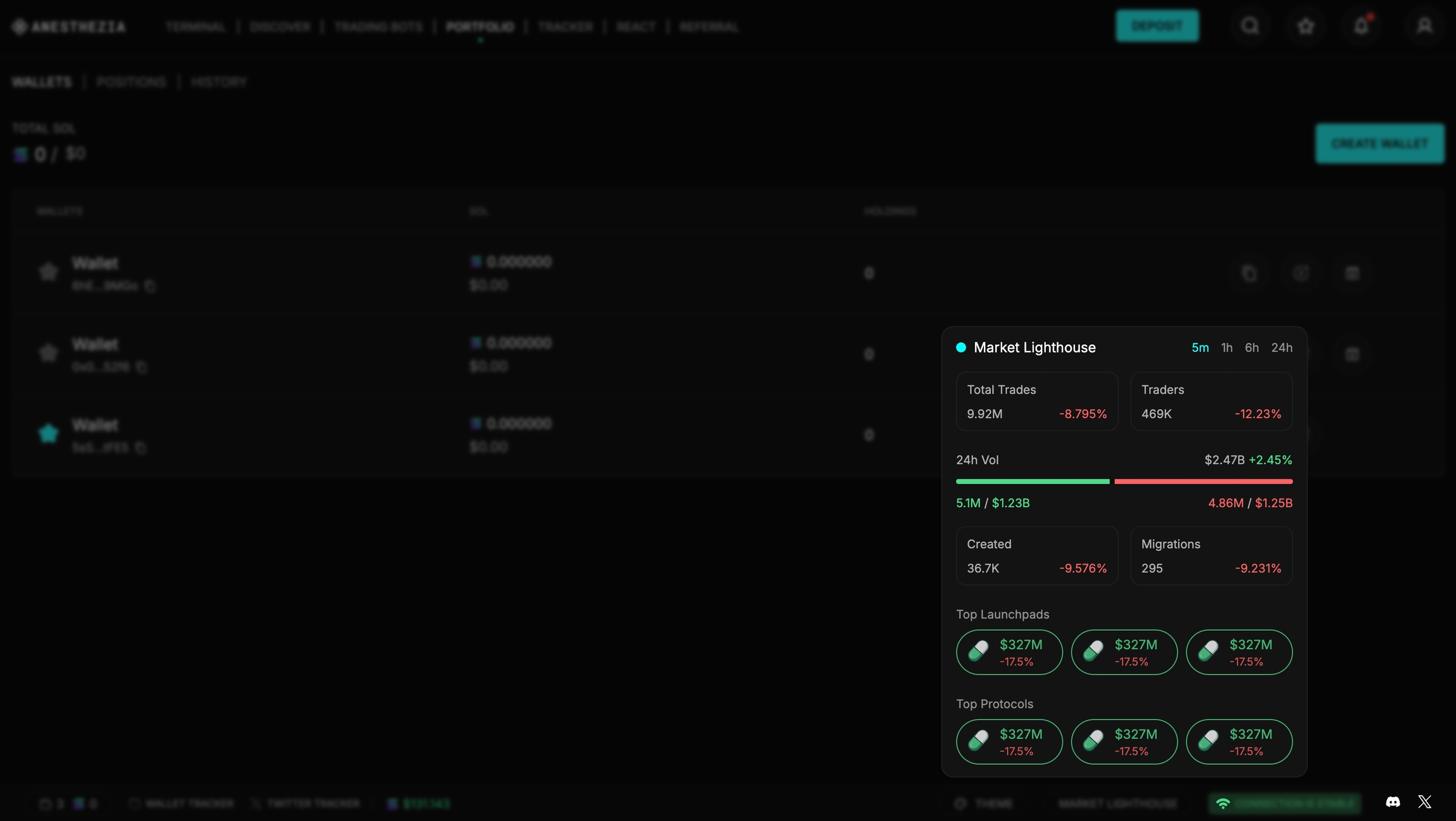 Раздел DEXes Statistics предоставляет агрегированные данные в реальном времени с децентрализованных бирж во всех поддерживаемых сетях. Он позволяет пользователям отслеживать рыночную ликвидность, торговый объем и распределение активности напрямую в интерфейсе Anesthezia.