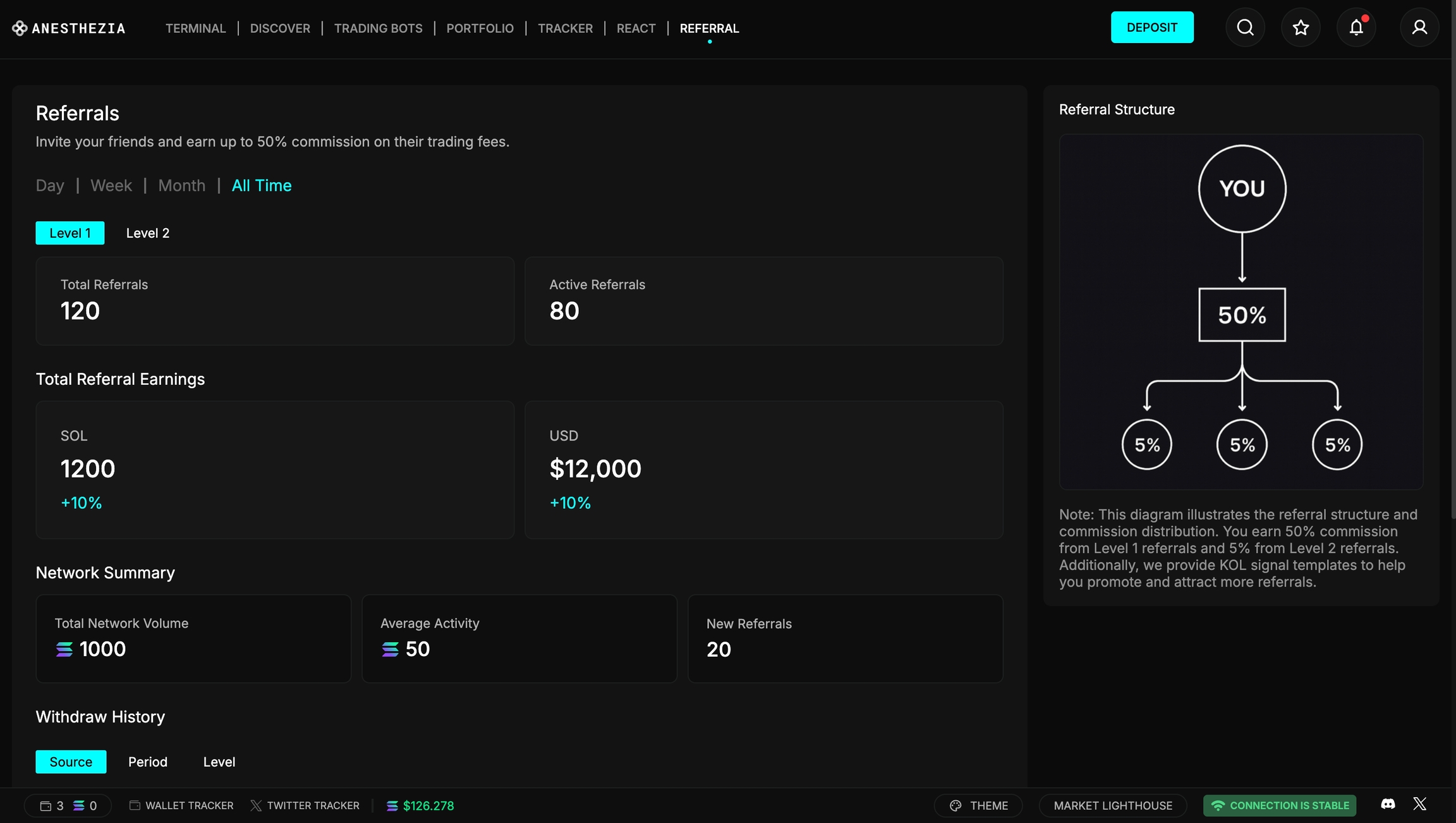 Программа Referral Program в Anesthezia вознаграждает пользователей за рост комьюнити через торговую активность.